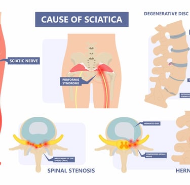 Sciatic nerve is the thickest and longest nerve in the body with 5 nerve roots. Starting from lower lumbar L4-L5 and upper sacral spinal nerves S1, S2, S3. Any compression of these nerve roots may contribute to pins/needles, numbness, radiating pain along the course of the nerve.